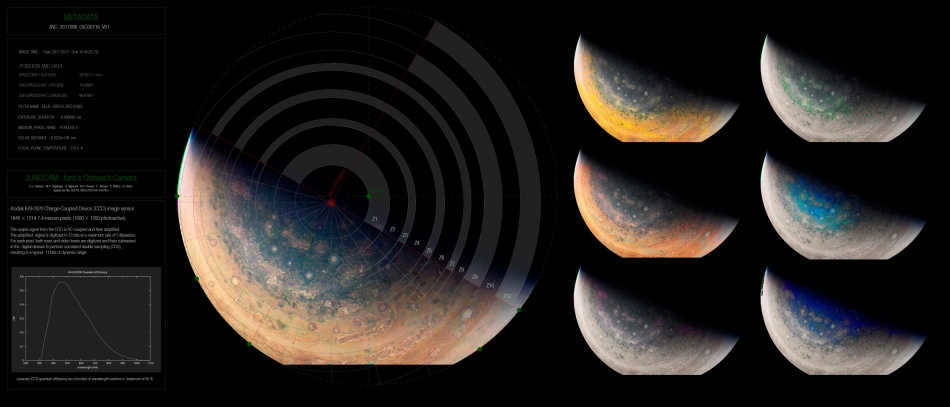 With its polar orbit, Juno has the unique ability to observe the planet from both above and below, providing the first comprehensive view of the intricate polar aurora systems. In the provided animation, the satellite Io generates the outermost stroke with its long tail. It is interesting to note the presence of colored areas, specifically white, green, and red. The red areas appear to be zones where electrons are ejected, which is quite uncommon as aurora borealis typically involve charged particles entering the atmosphere.