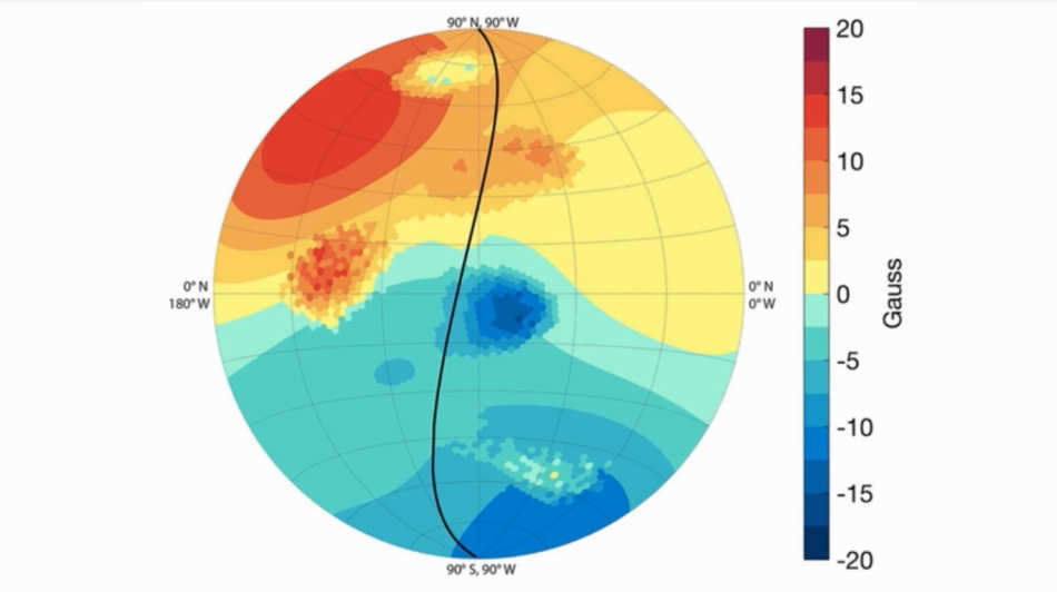 The magnetic field of Jupiter has also brought some unexpected findings. Firstly, it has been discovered to be more “expressive” than anticipated – areas where it was expected to be strong turned out to be even stronger, and areas where it was expected to be weak turned out to be even weaker. Furthermore, the magnetic field was found to be uneven. In the image above, the black line represents the Juno spacecraft’s path. The five distinct areas of interest indicate where the magnetic field deviated from the background (red – stronger, blue – weaker) in order to produce the data collected along the black path. The irregularity of the magnetic field may suggest that the planetary dynamo is situated above the zone of metallic hydrogen, within the molecular hydrogen zone.