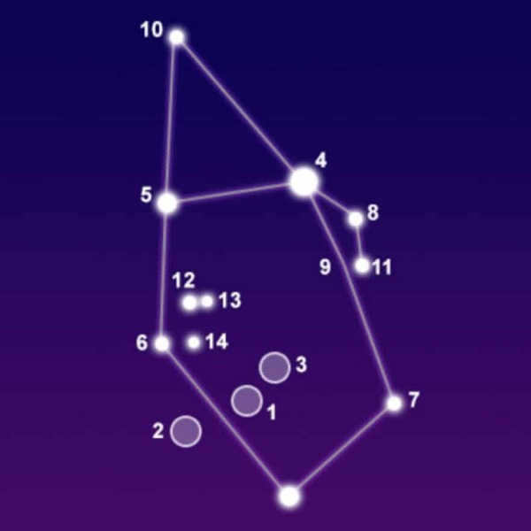 One more double star in this celestial pattern is the zeta of Ascendant. Its historical names are Hedus and Sadatoni. It shines with a brightness 1,700 times greater than that of the Sun. This system is made up of two parts. The first part is an orange giant belonging to the K4 spectral class. The second part is a blue-white star located on the main sequence and belonging to the B5 class. Every 2.66 years, it “disappears” behind a dimmer but larger part. As a result, the star’s total brightness decreases by approximately 15%.