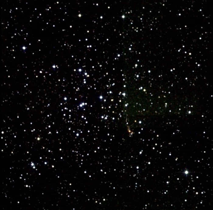 An oblique cross or the letter Pi is formed by the brightest stars in M38. The most prominent star is a yellow giant of the G0 class, with an apparent magnitude of 7.9. Despite its distance, it is able to shine 900 times brighter than the Sun. It measures 25 light years (20′) in diameter and is estimated to be 220 million years old.