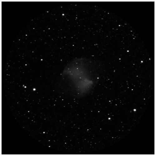 A rough depiction of the Dumbbell planetary nebula M27 in the Foxy constellation as seen in a clear sky using a 250-300mm telescope.