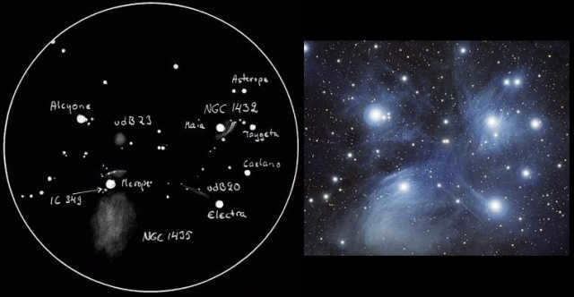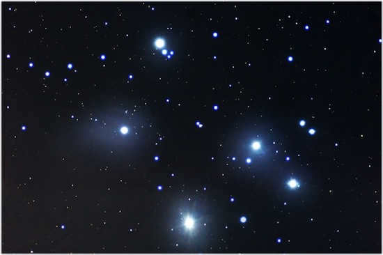 The Pleiades star cluster. Situated in the Taurus constellation. The Pleiades contains approximately 1000 stars, but not all are visible from Earth. The stars are surrounded by a blue halo, which is a nebula that engulfs the star cluster. The nebula is only visible around the most luminous Pleiades stars.