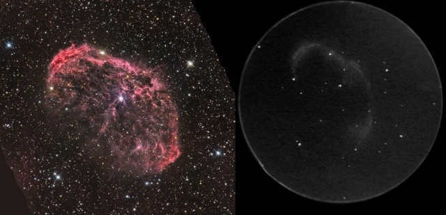 The image showcases the Crescent Nebula (NGC 6888), also known as the Crescent Nebula. The photograph on the left displays the nebula, while the image on the right demonstrates its appearance when observed through a telescope: