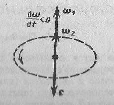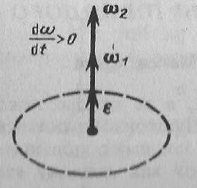When an object spins around a stationary axis, the angular acceleration vector ε points in the same direction as the vector representing the tiny increase in angular velocity. When the object is accelerating, the vector ε aligns with the vector ω (Fig. 3), while in deceleration, it points in the opposite direction (Fig. 4).