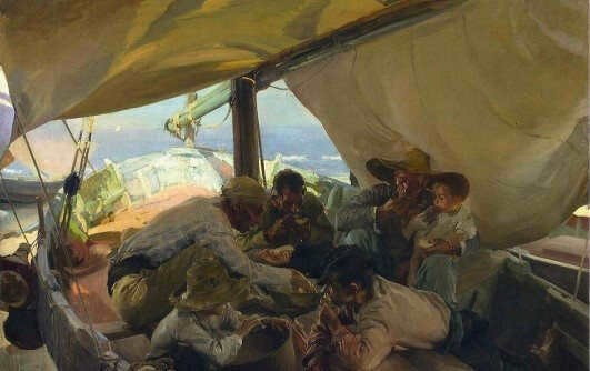 Another instance of a painting featuring a intricate lighting arrangement is Lunch on the Boat by Joaquin Sorolla. The scene includes multiple sources of light. On the boat, we observe numerous reflections; the light filters through a sail draped over the mast, casting a glow on the boat. The focal area creates a warm shadow, which provides a striking contrast to the cool sunlight outside.