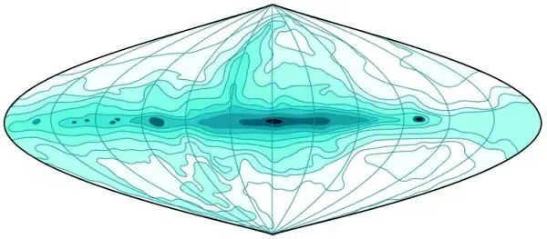 The second challenge lies in the fact that more than 50% of the interstellar matter in the Galaxy consists of neutral hydrogen, which does not emit light or absorb it. Information about the distribution of neutral hydrogen in the Galaxy has been obtained through radio astronomical research, which has utilized the properties of the hydrogen atom’s structure. It has been discovered that the hydrogen atom’s main energy level has two sublevels. The transition from one sublevel to the other emits a quantum with a frequency corresponding to a wavelength of 21 cm. On average, this transition occurs once every 11 million years in each individual hydrogen atom, but because hydrogen makes up the majority of the Galaxy’s matter, the radio emission at a wavelength of 21 cm is quite strong (Figure 6.4).