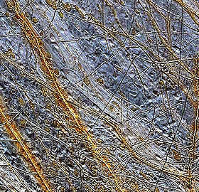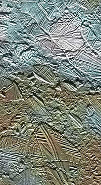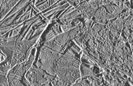 - Areas composed of lines and streaks. These lines and streaks are cracks and fractures in the icy shell of the planet. They encircle the entire surface.