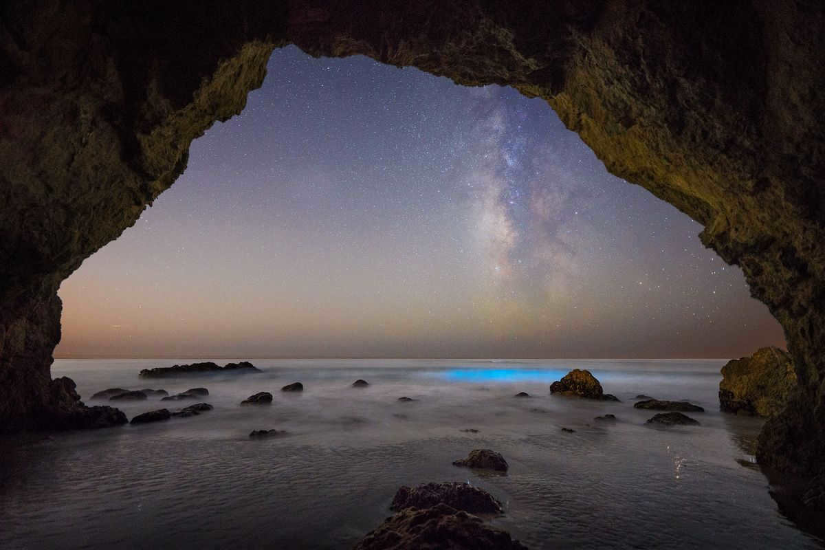 Witness the phenomenon of bioluminescence in Malibu as it illuminates the night sky, creating a stunning contrast against the backdrop of the Milky Way. Captured with a shutter speed of 13 seconds, an aperture of f/1.8, and an ISO of 4000.
